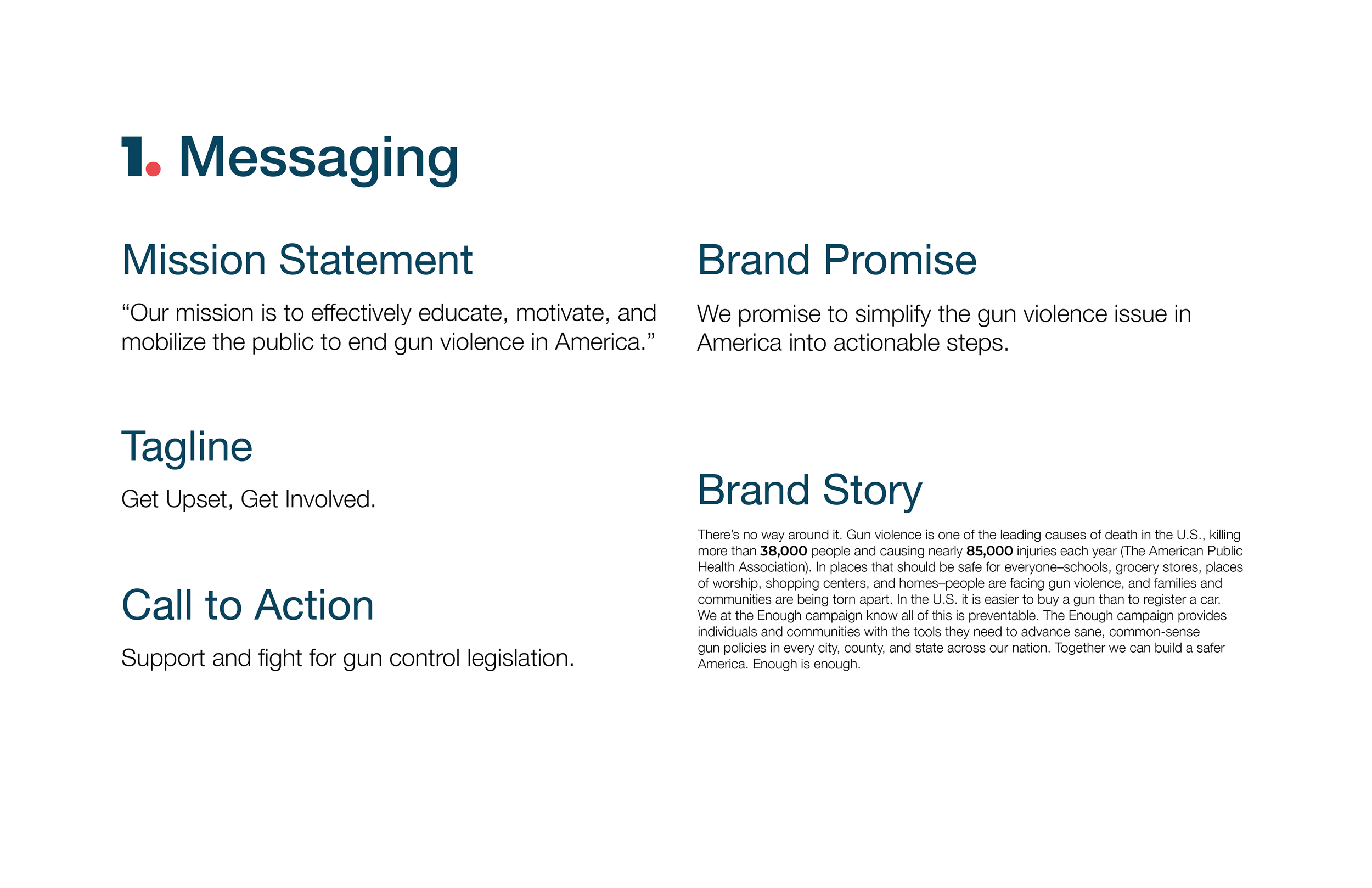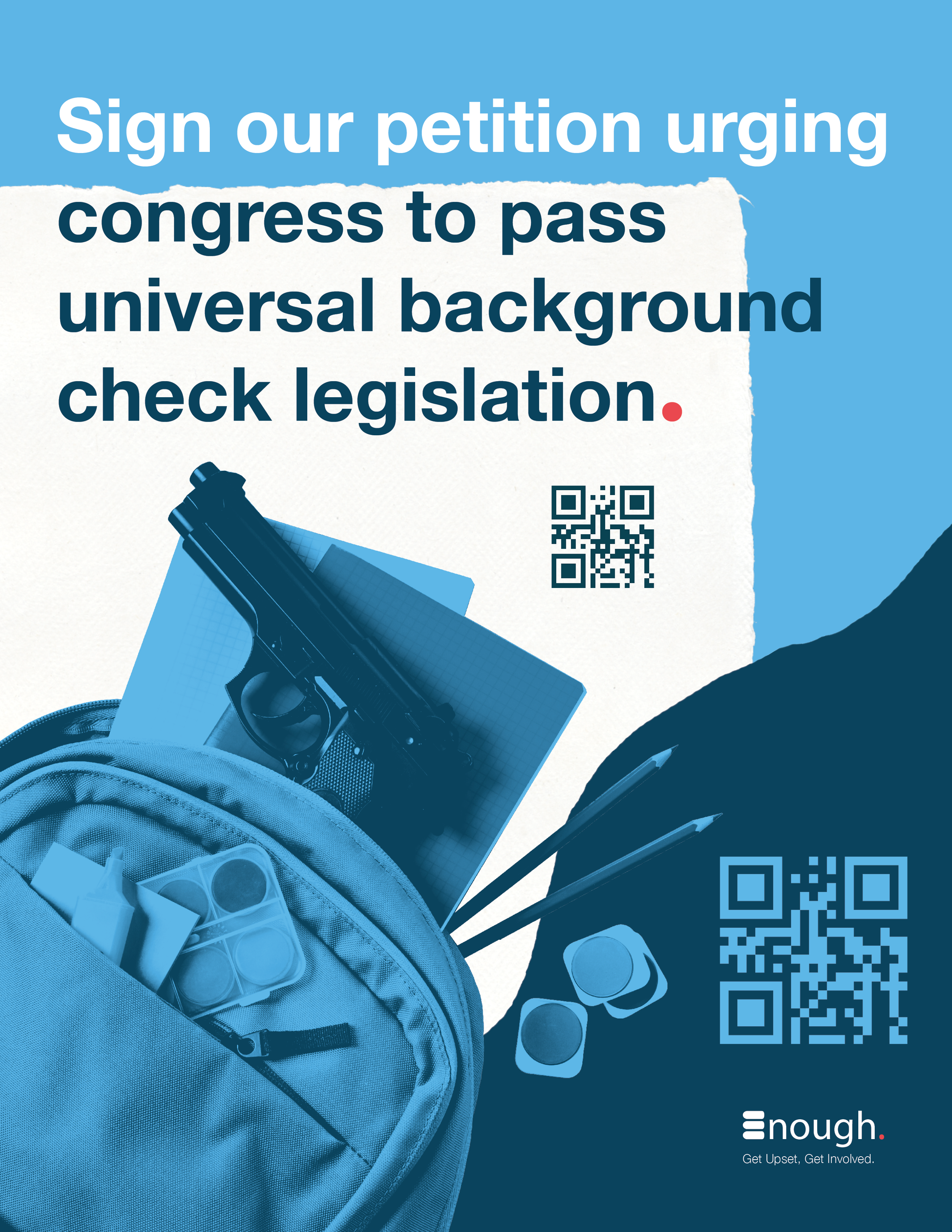 This brand guide defines the messaging and visual identity of the Enough campaign. The design draws inspiration from newspapers and layering, symbolizing the accumulation of this ongoing crisis of gun violence in the U.S. To reinforce the message, I used red and blue in slightly off-tone shades from traditional U.S. colors, representing a ‘tainted’ America and emphasizing that gun violence is a national issue. Additionally, I incorporated light blue, pink, green, and red to evoke both compassion and urgency. In the logo, I manipulated a figure-ground relationship between the colors blue and white to form the word “Enough” in th shape of a hand holding a gun, with the 'E' in the logo symbolizing both bullets and fingers. Gradients overlay images to maintain color palette consistency while reinforcing the figure-ground concept present in the logo.